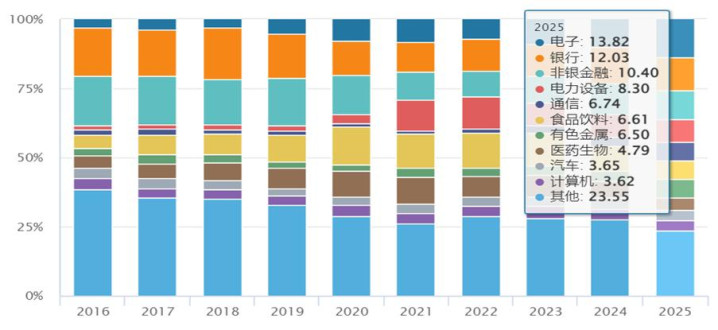 作为A股最具代表性的指数,沪深300指数素有A股“晴雨表”之称,覆盖科技、金融、消费等代表性板块,其板块权重分布通过定期调仓实现“更新换代”,近年来电子、通信等高端制造行业占比逐渐超过55%,长期走势与中国经济结构性升级趋势基本吻合。